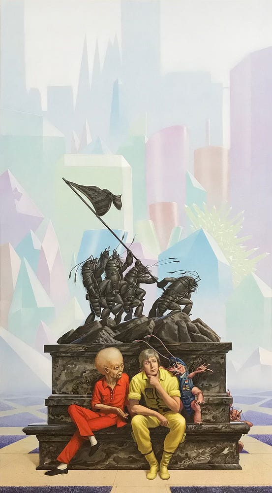 I had that book in the mid 80s and immediately recognized that awesome cover! The guy with the big head is “Many Face” who had several brains transplanted into his head, so he was super smart with numerous personalities. The aliens came demanding to talk to the U.S. president. The U.S. no longer existed so the Chinese chose this random blonde guy from Mississippi to act like he was the president. The aliens were hilarious - all they cared about was war and “fornicating” lmao. That cover captured the characters perfectly!