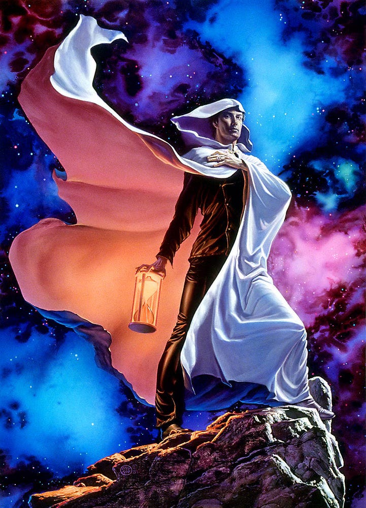 The latter is my main reason for taking a 'portraiture' approach to these covers. In this case, I chose Chronos with his major attributes: his hourglass and cape.