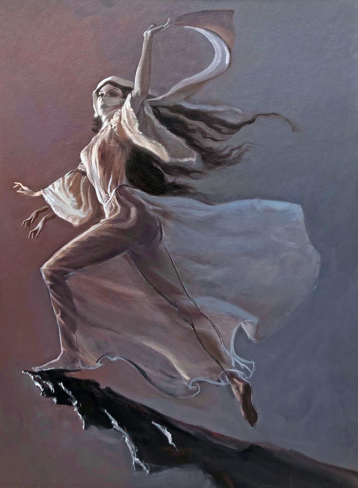 I like the idea that it presages her walk into the fire, when She is bathed in the ruddy sun-glow with the fogs and mists swirling about her. Also, She is standing on the splinter of rock, in a commanding posture, fearlessly leading the way…such a great summing up of her character.